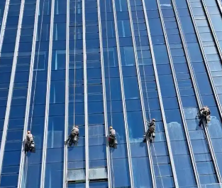 工人們采用"自上而下"的垂直作業(yè)方式,這不僅是效率的選擇,更是安全的必然。從樓頂錨點(diǎn)固定主繩開始,每位清潔工都要經(jīng)歷三重保險(xiǎn):防墜器如影隨形,當(dāng)下降速度異常時(shí)會(huì)瞬間鎖止;備用安全繩平行設(shè)置,形成雙保險(xiǎn);配重系統(tǒng)經(jīng)過精密計(jì)算,確保受力均衡。這些措施共同編織成一張看不見的安全網(wǎng),讓工人在擦亮城市"外衣"時(shí)無后顧之憂。