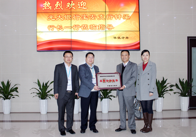 2012年12月27日,中國(guó)光大銀行深圳寶安支行行長(zhǎng)鐘梁一行蒞臨華迅方舟集團(tuán),向集團(tuán)贈(zèng)送了承載著光大寶安支行與華訊方舟集團(tuán)深厚合作情誼的“戰(zhàn)略合作伙伴”牌匾