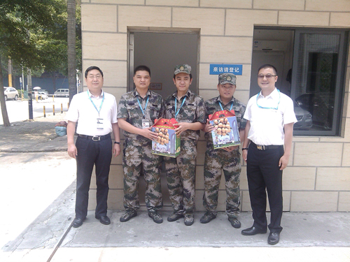 8月1日,正逢建軍節(jié),集團副董事長兼總裁吳光勝、首席科學家黃永江來到公司門崗,看望慰問在崗的保安人員,并送上節(jié)日禮品。 吳總強調“華訊方舟的保安就是華訊方舟